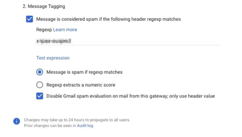 - Tick "Disable Gmail spam evaluation on mail from this gateway".